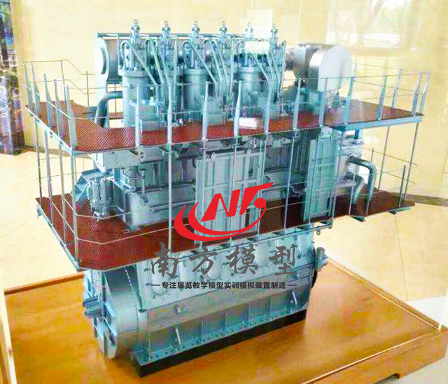 柴油機模型主要設備; 1:主要設備設施,由機座、主軸承、機架、導板、掃氣箱、氣缸蓋、活塞、活塞桿、 十字頭、連桿、曲軸、噴油器、增壓器等組成;整體比例協調、原理準確色彩靚麗、