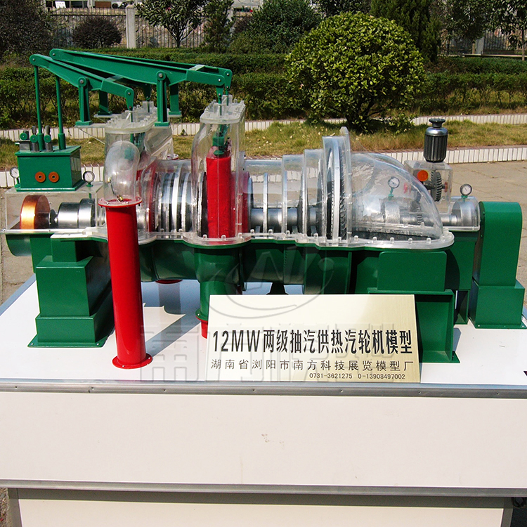 4、燃氣輪機模型模塊 燃氣-蒸汽聯合循環發電模型;燃氣輪機模型采用西門子燃氣輪機SGT5-4000F為原型按照比例制作,通過中心軸線四分之一剖視制作,可透過剖面清楚觀察到內部結構,采用電動機提供動力帶動設備真實運轉,模擬整個F級燃氣輪機工作流程。通過不同分色管道內過LED燈光流,展示不同原料管道的煙氣流動工藝流程。燃氣輪機模型全面、準確反映燃氣輪機仿真模型整體機構,模擬電動演示;葉片采用全金屬制作(銅或鋁),軸采用實心不銹鋼制作,軸承采用不銹鋼制作。其余部件主要采用PVC工程塑料或有機玻璃制作,為了方便教學內部組成部件采用部分結構分色展示;燃氣輪機模型燃燒室采用環型燃燒室,在燃燒室內殼,外殼(采用透明有機玻璃制作,全透明結構)體所形成的環形空腔內(采用LED燈模擬燃燒),有一個由內,外環構成的火焰管道(采用分色玻璃管道制作),在環形火焰管頭部沿周向均勻布置諾干噴嘴和旋流器(采用PVC工程塑料制作,高級汽車烤漆著色)