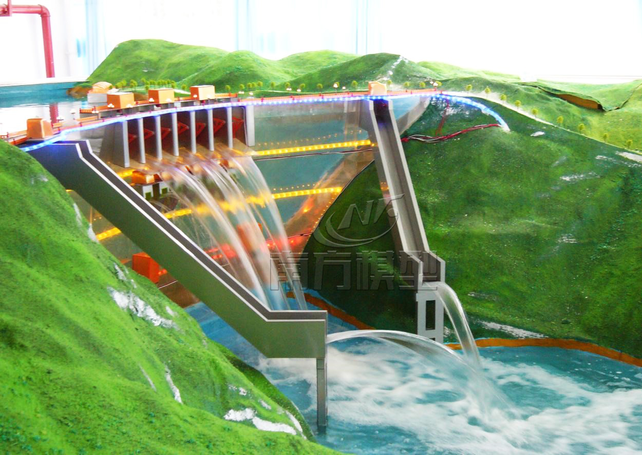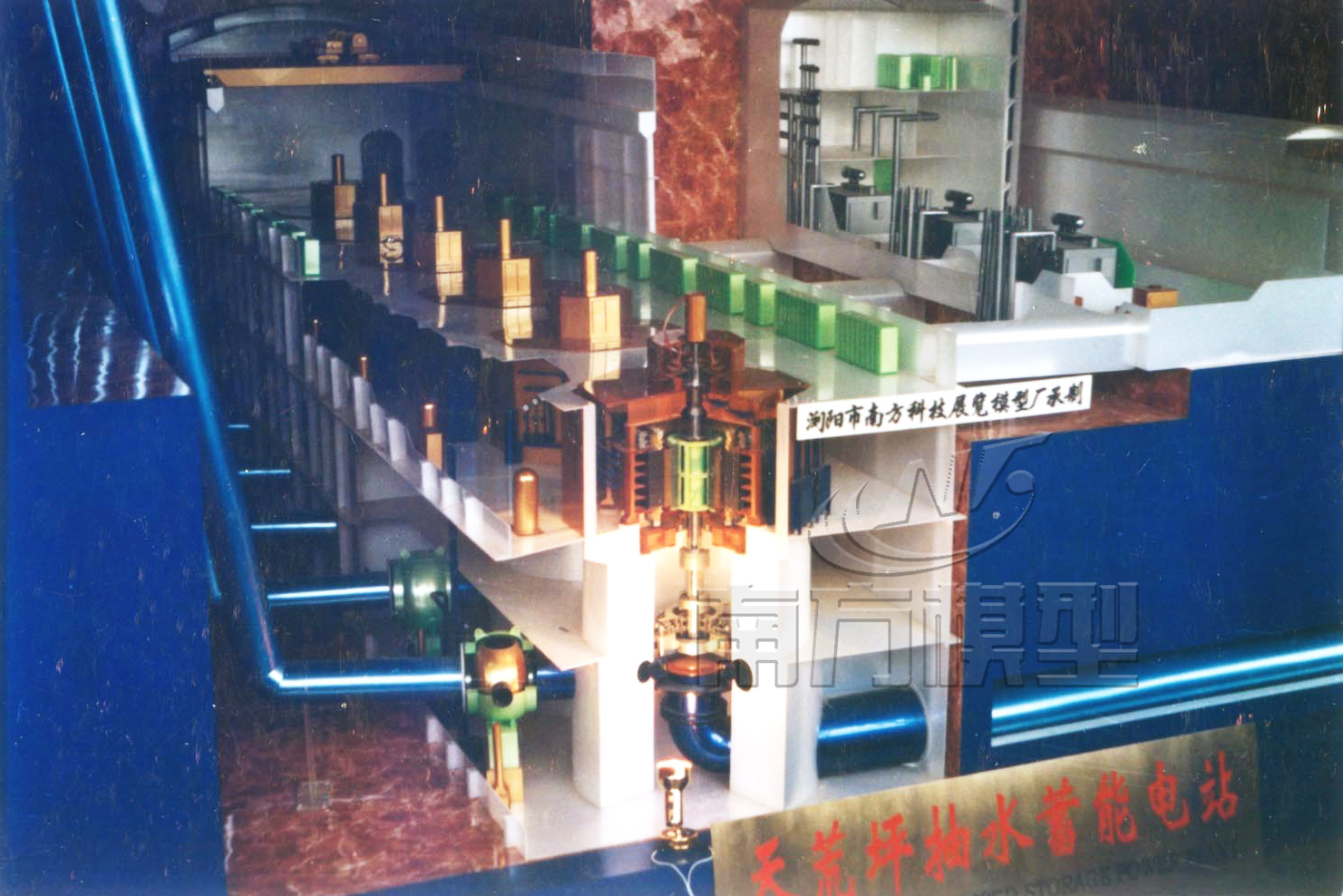 模型要將整個山形、山體、上庫區、下庫區、地面開關站、氣象雷達站、招待所、辦公大樓、中控室,地形按實際布局做出。地下廠房將山體局部剖開,能看到地下廠房內聲光流動演示狀態。正面向將山體做成全剖面形式。這樣可清楚看到,上水庫、下水庫、輸水系統、地下廠房。山體采用進口玻璃鋼膠,進口油漆及進口裝飾材料制作。電站主廠房剖開,可以看到六臺機組的布置情況;其中做出一臺機組的剖面,詳細做出發電機的定子繞組、轉子、主機架和水輪機的進水閥、導葉、轉輪、蝸殼、尾水管供水管路等。