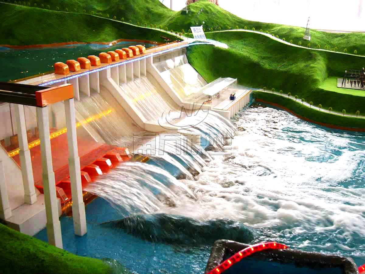 7、抽水蓄能電站模型綠化展示: 電站沙盤模型環境以實際原型微縮,整體環境力求精細化,營造視覺上享受;以獲得更貼近真實合理的視覺,充分體現出自然與環境相互融合的特性。采用整體燈光的形式來表示;工藝流程燈光將采用分色LED動感燈光演示。對建筑物上標識有文字說明標牌,在蓄能電站模型醒目位置安裝有產品簡介。將現代聲光電技術融入本項電站模型當中,在整體展示中構造出獨特的觀賞效果。