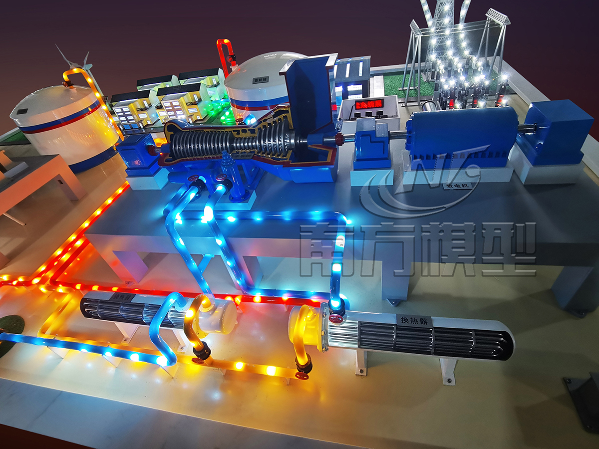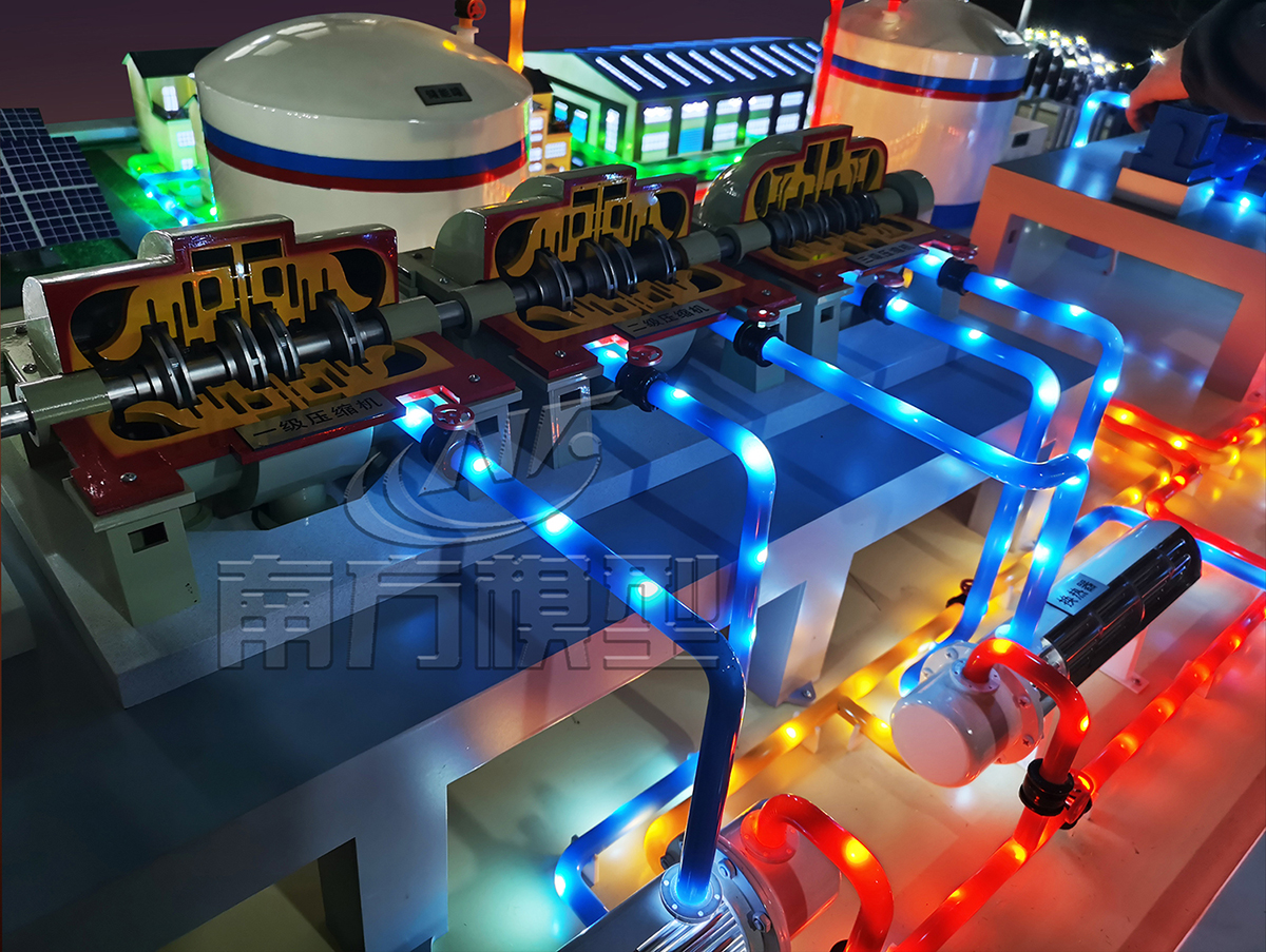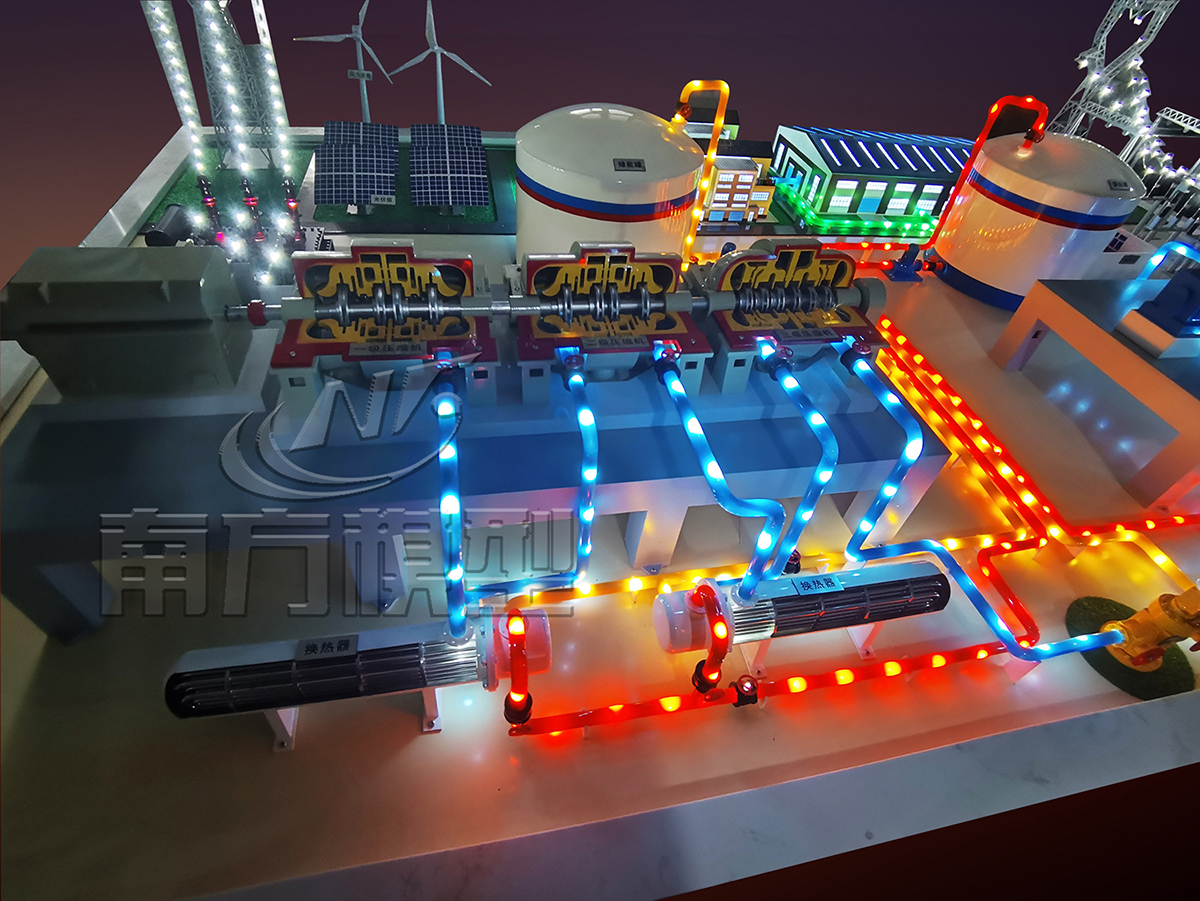 壓縮空氣儲能電站模型制作內容: 儲能電站模型展示內容按照儲能電站實際尺寸等比例微縮仿真制作,展示內容包括壓縮空氣儲能車間、儲能容器、輸電線路、變電站、壓縮機、換熱器、透平系統等。該模型利用LED光電技術仿真模擬流質與氣體運行方向以及做功方式,其中透平系統、壓縮機、換熱器、儲熱容器等主要系統部件做¼剖視,詳細展示內部結構構造與設備部件。透平系統與壓縮機仿真旋轉作模擬演示,設備主體噴涂汽車烤漆,色彩亮麗并具備工業質感,適于長期展示。