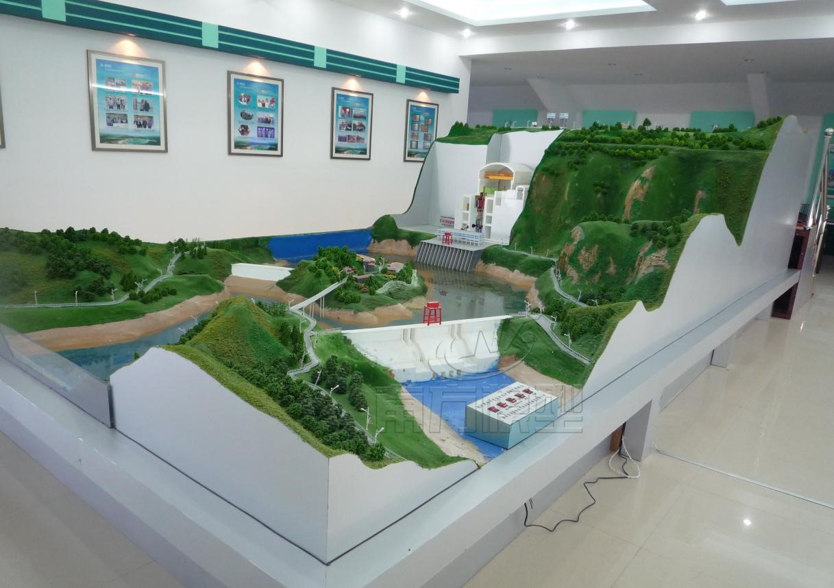 抽水蓄能電站模型山體進行剖面后顯示高壓管道系統和電廠機組設備,能立體顯示上池的高壓水管路和尾水到下庫的管路,顯示機組抽水與發電的水流方向。抽水蓄能電站模型顯示機組過水發電以及顯示電流通過IPB母線、變壓器、GIS、架空線路送網變電站,IPB的母線使用LED燈光流動。 抽水蓄能電站模型包括含上水庫、下水庫、電站主廠房、副廠房、主變洞、尾水閘門洞、母線洞、壓力輸水鋼管、中控室、開關站、通風豎井、電纜豎井、施工支洞、上下庫閘門啟閉設備及其設備等,色彩配置與原物相符;將整個山形、山體、庫區、地面開關站、雷達站、招待所、辦公大樓、中控室,地形按實際布局做出。地下廠房將山體局部剖開,能看到地下廠房內聲光流動演示狀態。正面向將山體做成全剖面形式。這樣可清楚看到,上水庫、下水庫、輸水系統、地下廠房。