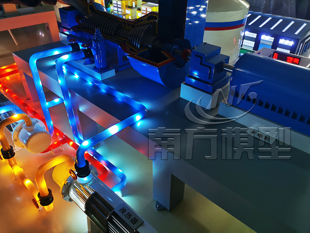 抽水蓄能電站整體布局仿真模擬實訓設備按比例反映出庫區的地形地貌和各種建筑物以及各類設備實物,抽水蓄能電站機組模型采用一臺1/4剖面、機組蝸殼使用透明有機玻璃,進行立體全包圍,能看到內部的水輪機的形狀;模型清楚地表達了廠房的總體結構和水電廠的各部分組成。